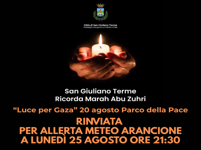 San Giuliano Terme, 20 agosto 2025 - L'Amministrazione comunale di San Giuliano Terme informa che a causa dell'allerta meteo arancione emessa dal Cfr della Regione (dal pomeriggio di oggi alle ore 18 e per tutta la serata/nottata), la fiaccolata "Luce su Gaza" prevista per stasera al Parco della Pace, dove sarebbero intervenuti i rappresentanti delle associazioni, è stata rinviata a lunedì 25 agosto sempre alle ore 21:30 e nello stesso luogo.