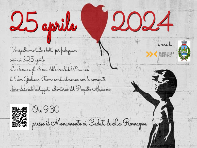 Il comune di San Giuliano Terme, Medaglia d’argento al merito civile, come ogni anno celebra il giorno della Liberazione il 25 aprile. Di seguito i luoghi che saranno interessati dalle cerimonie e dalle deposizioni delle corone alloro. A seguire le informazioni sul Progetto Memoria e sugli Archivi della Memoria che da anni caratterizzano l'impegno dell'Amministrazione comunale verso la comunità e verso i più giovani.