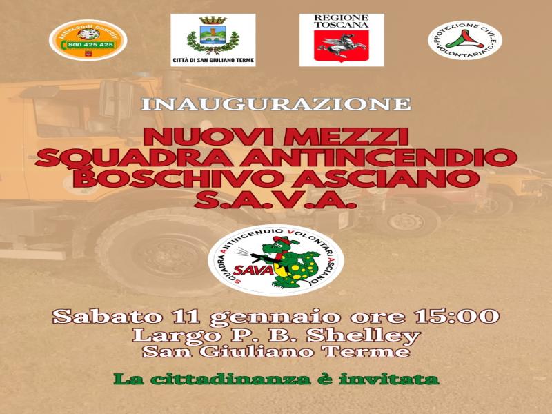 Taglio del nastro dei nuovi mezzi della Squadra Antincendio Boschivo Asciano (SAVA) che si terrà sabato 11 gennaio alle ore 15 in piazza Shelley a San Giuliano Terme. Leggi il pezzo sull'inaugurazione
