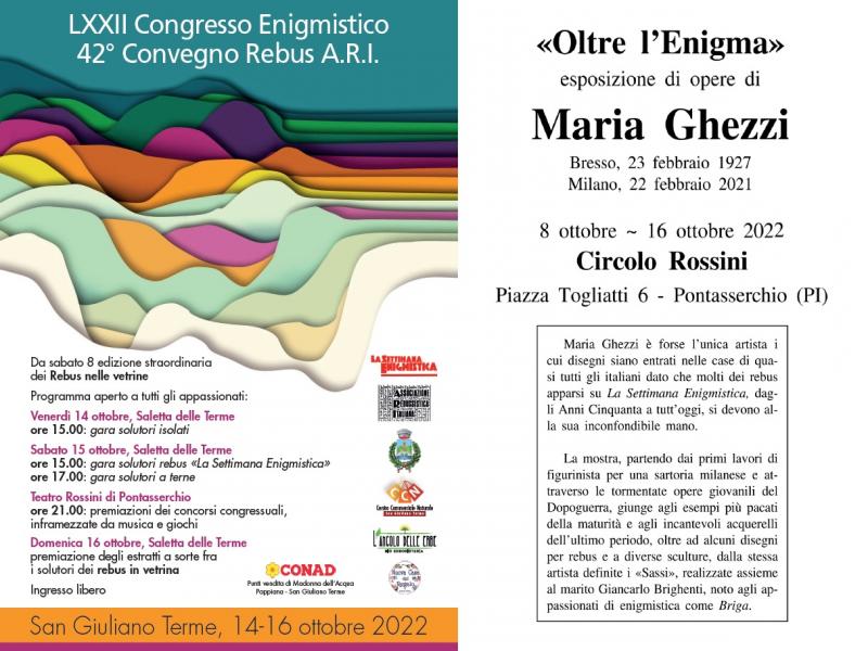 Fino al 16 ottobre si terrà inoltre la mostra "Oltre l'Enigma" presso il circolo Rossini di Pontasserchio (piazza Togliatti, 6) con l'esposizione di opere della storica illustratrice de "La settimana enigmistica", l'artista Maria Ghezzi.