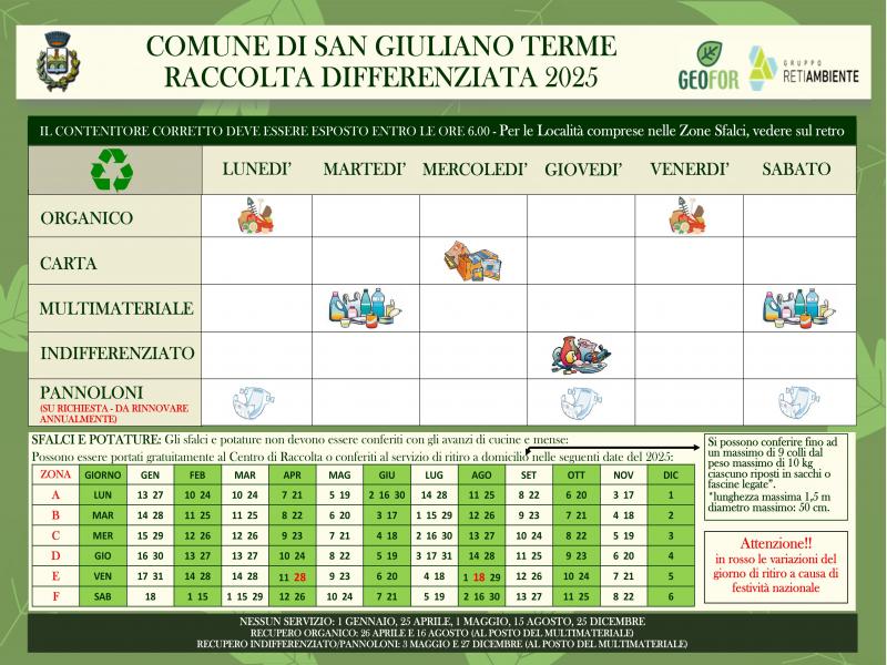 Si informano gli utenti della pubblicazione del nuovo calendario del porta a porta Geofor per il 2025, che include i servizi di raccolta di sfalci e potature e i servizi di raccolta su richiesta (sacco viola). Il calendario è consultabile anche sulla pagina di Geofor al seguente link https://www.geofor.it/s-giuliano-terme/calendario-raccolta-porta-a-porta-s-giuliano-terme/