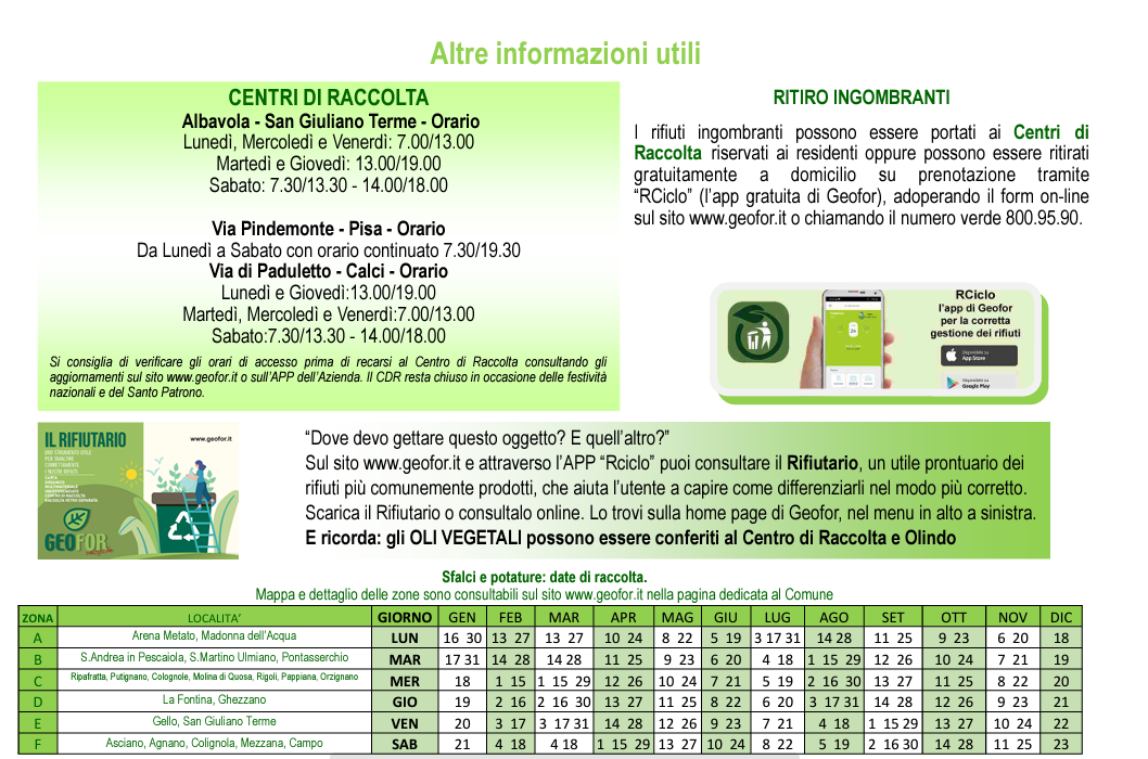 Le informazioni sui Centri di raccolta (orari e aggiornamenti) si possono trovare sul sito del Comune di San Giuliano Terme e sul sito di Geofor. Per il ritiro gratuito degli ingombranti a domicilio è possibile trovare tutte le informazioni sul sito di Geofor. Anche per il 2023 insieme al calendario della raccolta "classica" è inclusa anche la tabella con le date di raccolta degli sfalci e delle potature.