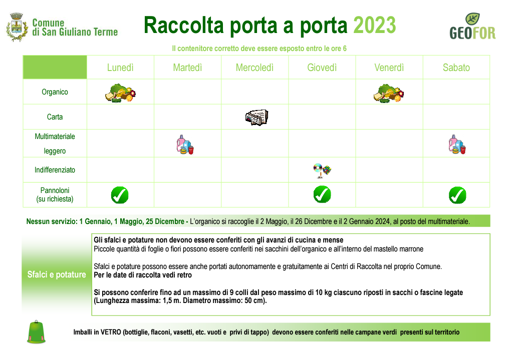 Si confermano i giorni di ritiro dello scorso anno: lunedì e venerdì organico, martedì e sabato multileggero, mercoledì carta (oltre all'organico alle utenze non domestiche), giovedì indifferenziato e ritiro personalizzato il lunedì e sabato dei pannolini (sacco giallo), riservato a persone non autosufficienti e alle famiglie con bambini di età inferiore a 2 anni (in mancanza di sacchi gialli, il pannolino va conferito nel rifiuto indifferenziato). Il vetro deve essere conferito nelle campane verdi in strada, mentre l'olio vegetale esausto può essere conferito ai Centri di raccolta o in Olindo.