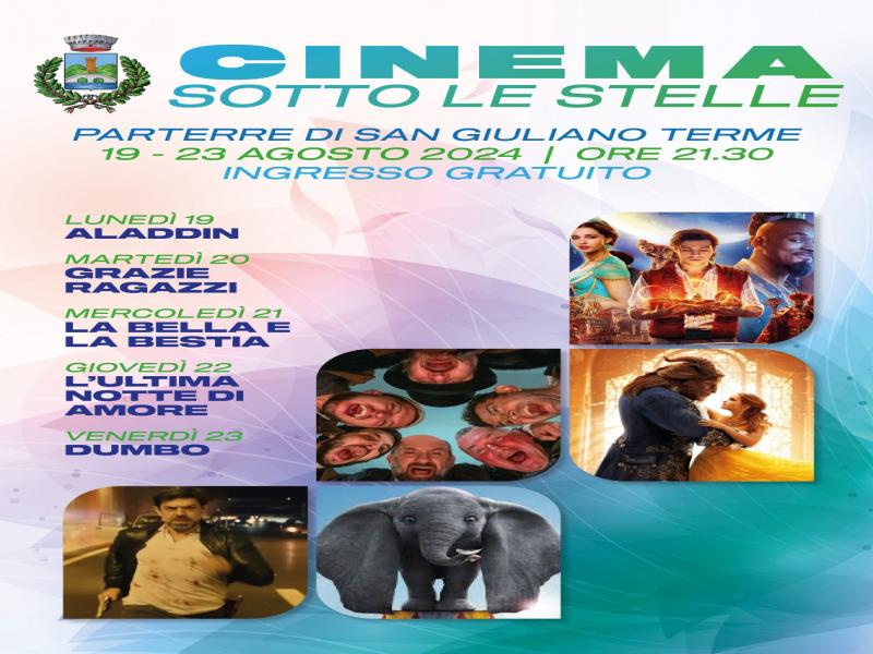 San Giuliano Terme, 16 agosto 2024 - Tornano gli eventi dell'Estate sangiulianese, in attesa dei nuovi cicli di iniziative tra fine agosto e settembre. Da lunedì 19 a venerdì 23 agosto il Cinema Arsenale approda a San Giuliano Terme, dove al Parterre verrà allestito il "Cinema sotto le stelle" in collaborazione con l'Amministrazione comunale. Primo appuntamento sarà il film "Aladdin", lunedì, per poi proseguire martedì 20 con "Grazie ragazzi", mercoledì 21 con "La bella e la bestia", giovedì 22 con "L'ultima notte di amore" e venerdì 23 con "Dumbo". Gli spettacoli si terranno dalle ore 21:30 con ingresso gratuito.