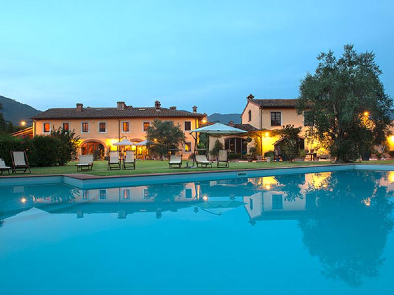 Un casolare circondato da un ampio giardino con piscina ed alberi di ulivi.