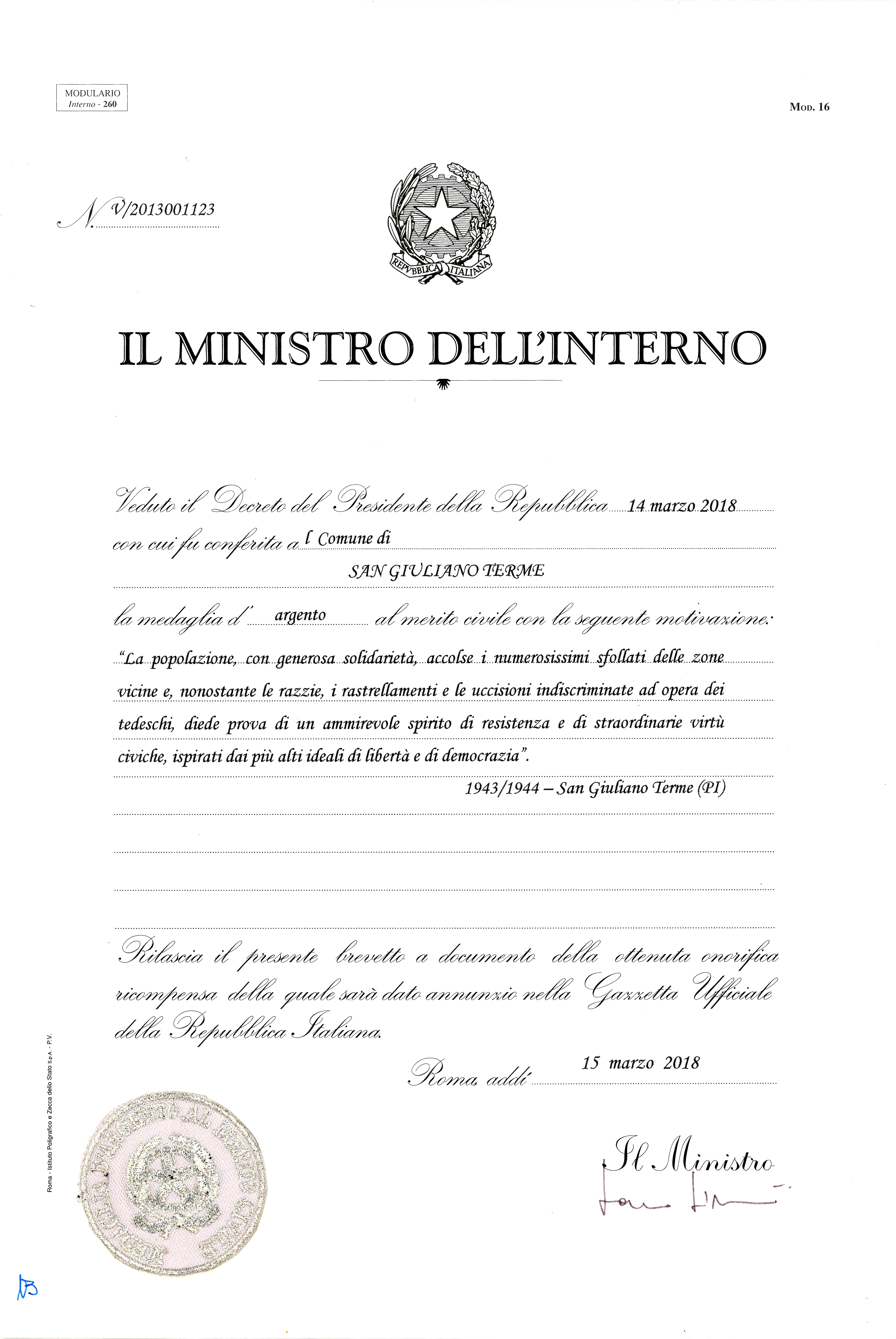 Ministero dell'interno - Medaglia d'argento a San Giuliano Terme