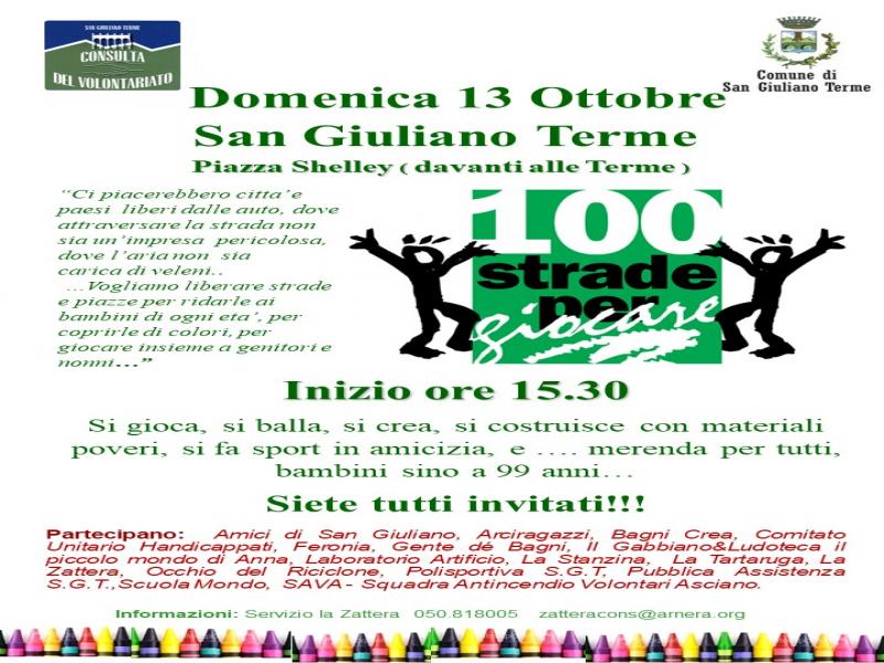 Torna “100 strade per giocare” a San Giuliano Terme, l’iniziativa (organizzata da Comune di San Giuliano Terme e Consulta del volontariato) che punta alla riscoperta del gioco all’aria aperta e nei luoghi pubblici, per viverli in maniera condivisa.