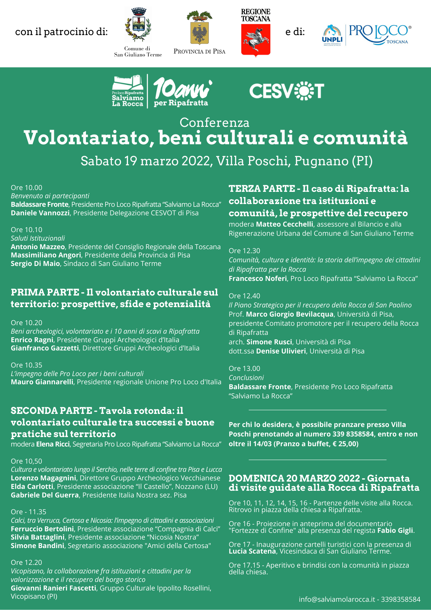 L'iniziativa è organizzata con il Cesvot e patrocinata dal Comune di San Giuliano Terme, dalla Provincia di Pisa, dalla Regione Toscana e da Unpli Toscana. Il programma completo della conferenza è disponibile sui canali dell'associazione, sia sulla pagina Facebook che sul sito salviamolarocca.it.