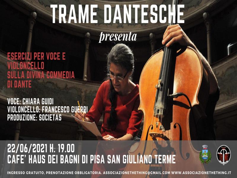 Parte martedì 22 giugno alle 19 il festival sangiulianese "Trame Dantesche", un progetto legato alle celebrazioni dantesche in occasione dei settecento anni dalla morte del poeta ma che vuole andare oltre. L'intento è quello di esplorare nuove forme di fruizione e comunicazione dell'opera di Dante. L'organizzazione è stata messa in piedi da The Thing promozione eventi e dal Comune di San Giuliano Terme.