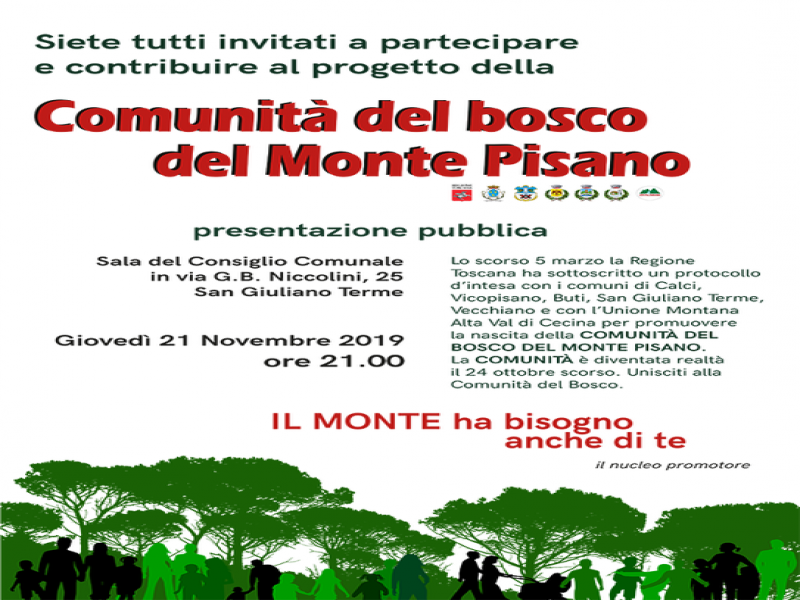 Giovedì 21 novembre, alle 21, nella Sala del Consiglio comunale di San Giuliano Terme (via Niccolini 25) sarà presentato il progetto Comunità del bosco, in base al protocollo d'intesa sottoscritto lo scorso 5 marzo dalla Regione Toscana con il nostro Comune e quelli di Buti, Calci, Vecchiano e Vicopisano.