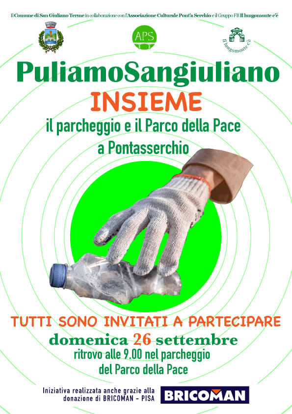 Domenica 26 settembre, il Comune di San Giuliano Terme, in collaborazione con l'Associazione Culturale Pont'a Serchio APS e il gruppo Facebook Il lungomonte c'è, organizzerà un'iniziativa di pulizia del parcheggio e del Parco della Pace "Tiziano Terzani" di Pontasserchio: "Puliamo San Giuliano Insieme". L'evento avrà luogo grazie anche al sostegno di Bricoman Pisa, che ha effettuato una donazione di materiale che aiuterà i volontari nel lavoro. L'invito è aperto a tutta la cittadinanza: appuntamento alle 9 nel parcheggio del Parco della Pace.