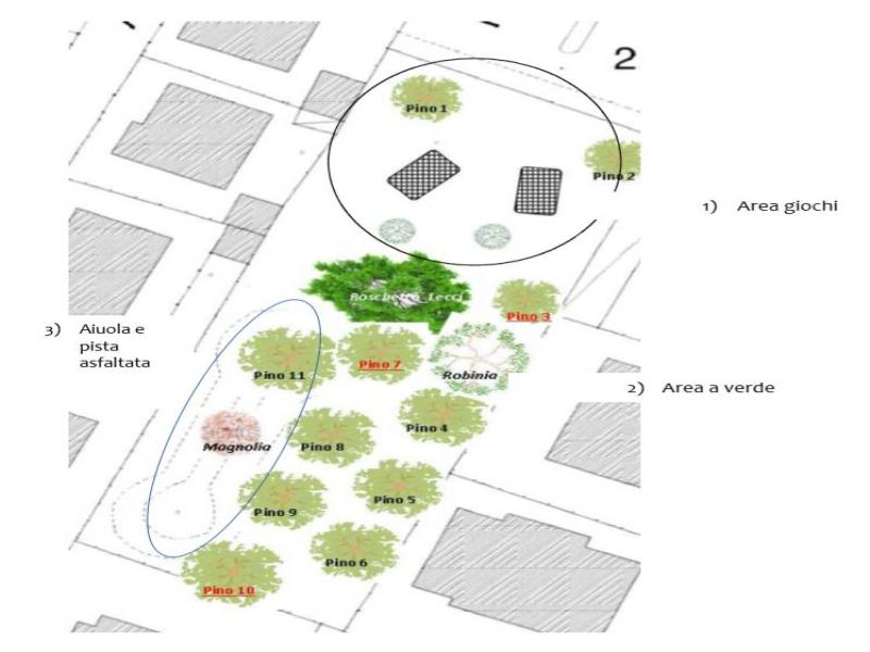 Abbattimento del pino inclinato posto a ridosso del muro di recinzione (P3); potatura del boschetto di lecci composto da cinque piante; potatura della pianta di robinia e rimozione della parte secca; abbattimento del pino inclinato dietro al bosco di lecci (P7) per consentire lo sviluppo di quest'ultimo e della robinia; potatura con rimonda dal secco delle cinque piante di pino disposte in doppio filare (P4, P5, P6, P8, P9) che assicurano l'ombreggiatura del parco; abbattimento del pino posizionato in prossimità del muro perimetrale del parco (P10).