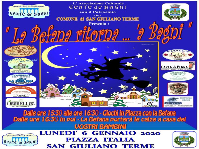 “La befana ritorna... a' Bagni” è l'appuntamento organizzato dall'associazione culturale Gente de' Bagni, e patrocinato dal Comune di San Giuliano Terme, in programma lunedì 6 gennaio in occasione dell'Epifania 2020.