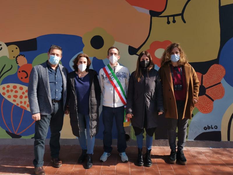 Presenti all'inaugurazione (da sinistra nella foto): Alessandro Benetti (dirigente scolastico dell'istituto comprensivo "G. B. Niccolini"), Sandra Bertolini (maestra, referente del progetto per la scuola), Filippo Pancrazzi (assessore all'ambiente del Comune di San Giuliano Terme), Ilaria Rapetti (Simurg Ricerche), Giulia Bernini (in arte Oblo artista di Uovo alla Pop).