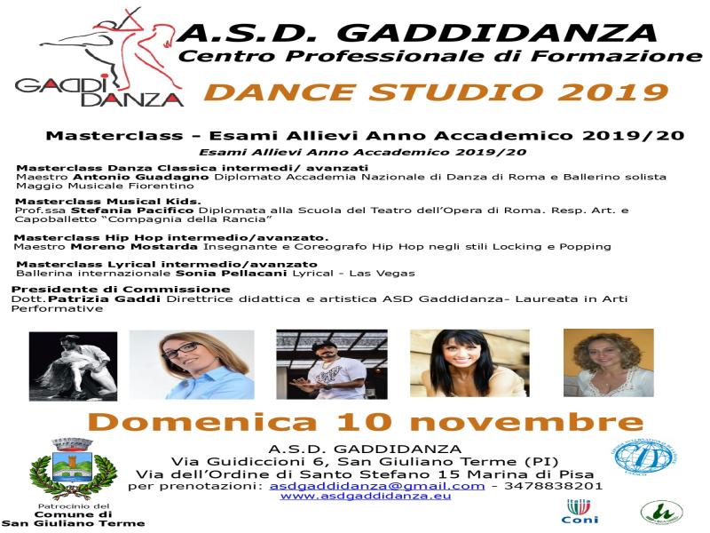 Domenica 10 novembre, nella sede dell’A.S.D. Gaddidanza (via Guidiccioni 6 a La Fontina, nel territorio comunale di San Giuliano Terme) si svolgerà Dance Studio 2019, evento ormai giunto alla sua quarta edizione e che gode del patrocinio del Comune di San Giuliano terme, che vede gli allievi della scuola impegnati negli esami di passaggio di livello con una commissione di docenti e ballerini di fama internazionale.