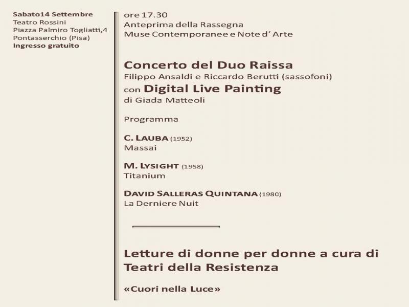 Appuntamento a sabato 14 settembre alle 17.30, quando potremo vedere sul palco il Duo Raissa, formato dai sassofonisti torinesi Filippo Ansaldi e Riccardo Berutti, laureati al conservatorio "Verdi" di Torino e vincitori di numerosi concorsi musicali nazionali e internazionali di musica da camera.