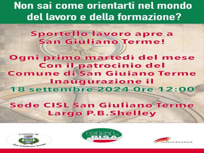 Domani, mercoledì 18 settembre alle ore 12, verrà inaugurato lo Sportello Lavoro presso la sede della CISL in Largo Shelley, un'iniziativa realizzata con il patrocinio del Comune di San Giuliano Terme e in collaborazione con l'agenzia formativa Aforisma.
