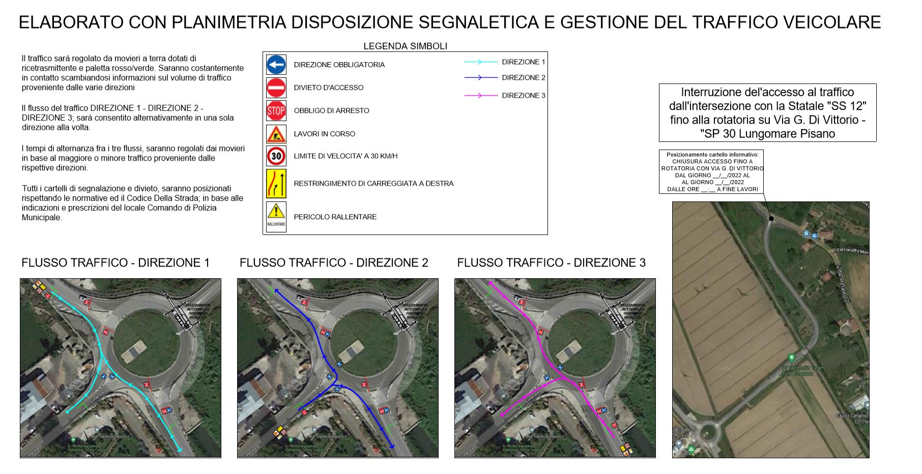 La viabilità sarà regolata come da grafica di seguito. In buona sostanza, non sarà necessario chiudere la circolazione del traffico su via Di Vittorio, sulla quale si dovrà procedere a senso unico alternato utilizzando solo metà rotatoria. Sarà invece in vigore il divieto di transito dall'incrocio con la SS12 alla rotatoria e viceversa.