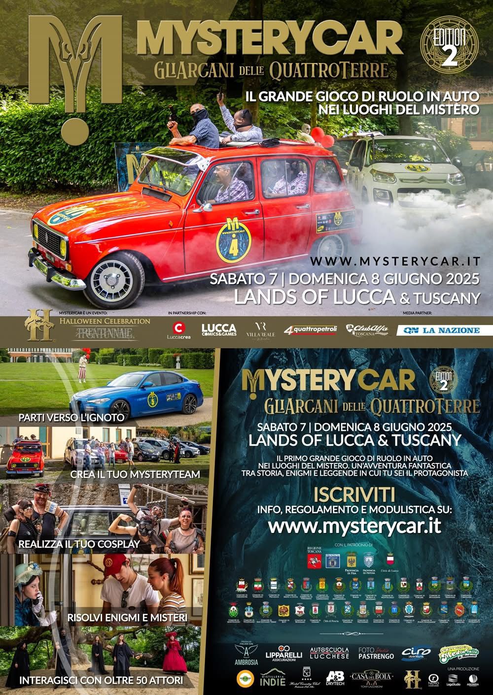 MysteryCar 2025 è promosso da Loga Studio con il patrocinio della Regione Toscana, delle Province di Pisa, Lucca e Pistoia e dei Comuni aderenti, tra cui San Giuliano Terme. L’iniziativa è sostenuta anche da partner prestigiosi come Lucca Comics & Games.