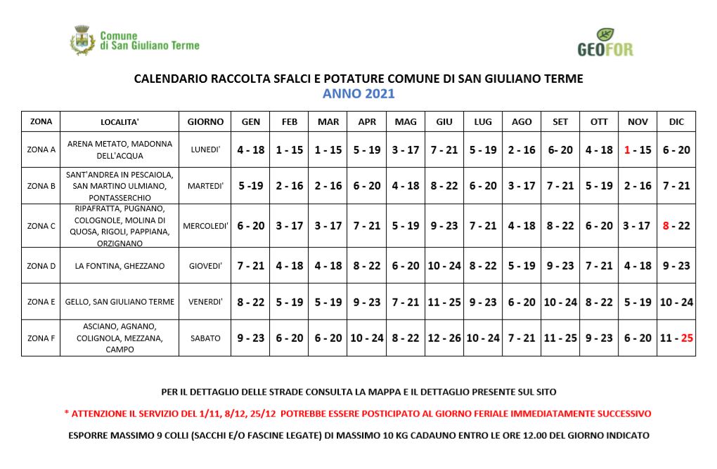 Geofor effettua il servizio di raccolta di sfalci e potature la settimana del primo e del terzo lunedì del mese. Si ricorda che il rifiuto deve essere esposto entro le 11.00 del giorno programmato (non il giorno prima) e conferito all'interno di sacchi o in fascine e privo di impurità, in un numero massimo di colli pari a 9, con un peso non superiore a 10 kg per ciascun collo.